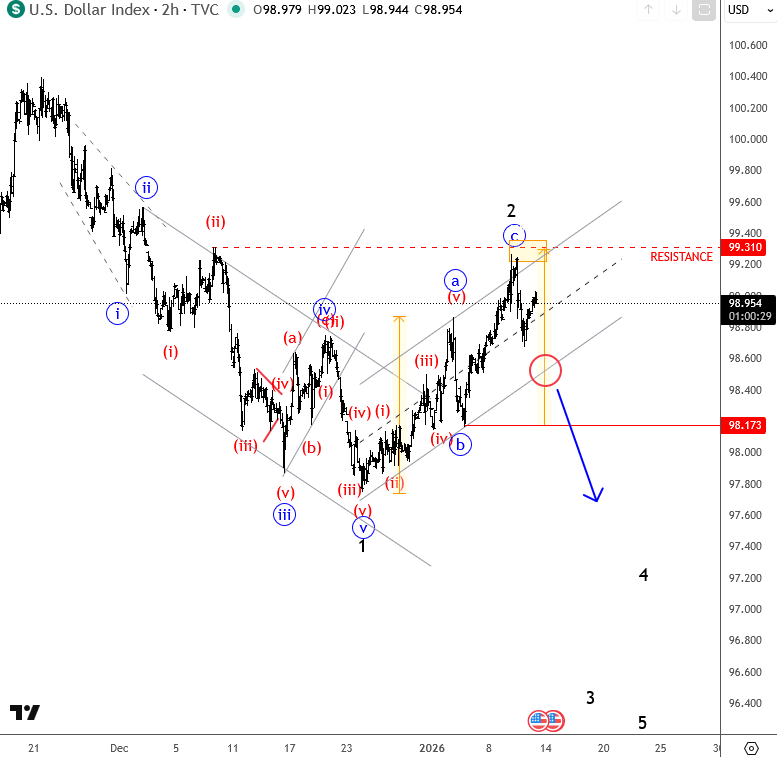 Another important point is the wave pattern on the dollar, which still looks very clear. We have five waves down followed by a three wave recovery now at resistance, so it feels like only a matter of time before the corrective channel around 98.50 is taken out. A daily close below that level would likely bring bears back into action and open the door for a drop toward the December 2024 lows.