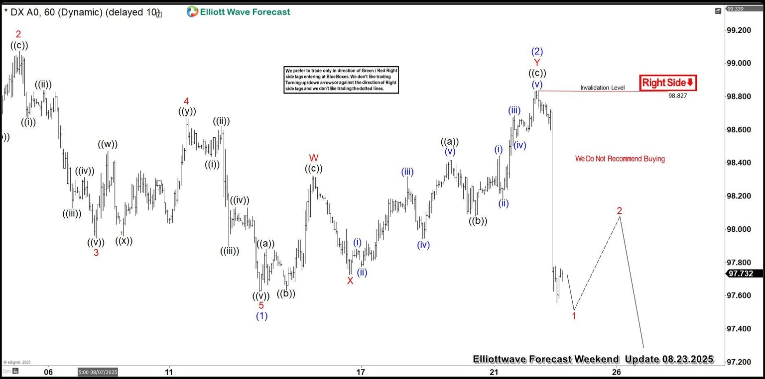 A few days later, we can see the result. The Dollar found sellers at the marked Equal Legs zone, as expected. DXY made a sharp drop from the sellers’ zone. The recovery peaked at 98.827. As long as it remains below that high, the next leg down may be in progress.