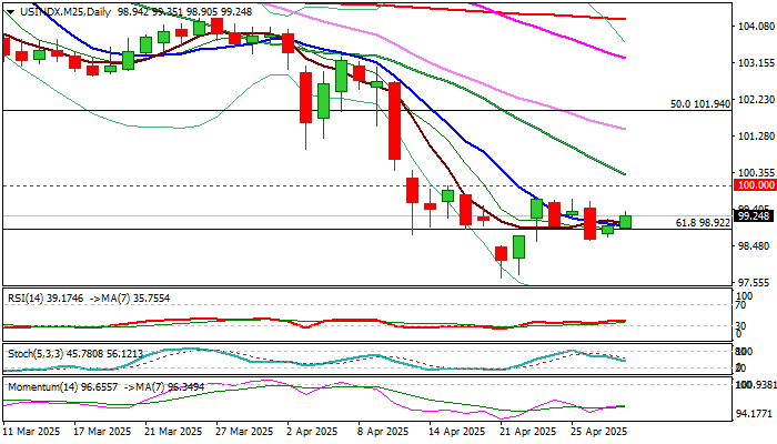 April’s drop presents the biggest monthly loss since November 2022, with monthly close below psychological 100 level to add to bearish signal, which still looks for verification on clear break below the floor of 2023/24 range (99.20) that would expose next significant support at 96.30 (bull-trendline off 2011 low).