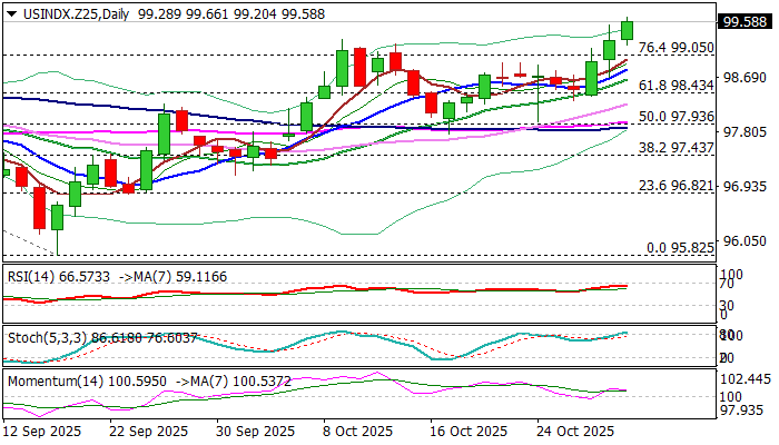 Fresh acceleration that extends into third straight day, broke above previous top (99.30) and nears psychological 100 barrier (also top of Aug 1), also bringing in focus falling 200DMA (100.25).