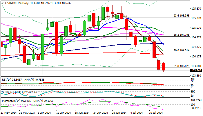 Dovish stance will reinforce growing expectations for rate cut and push the dollar further down, while hawkish comments would harm larger bears and give fresh boost to the currency, with lift above 200DMA (104.22) and violation of daily cloud base (104.49) seen as minimum requirement to revive bulls.