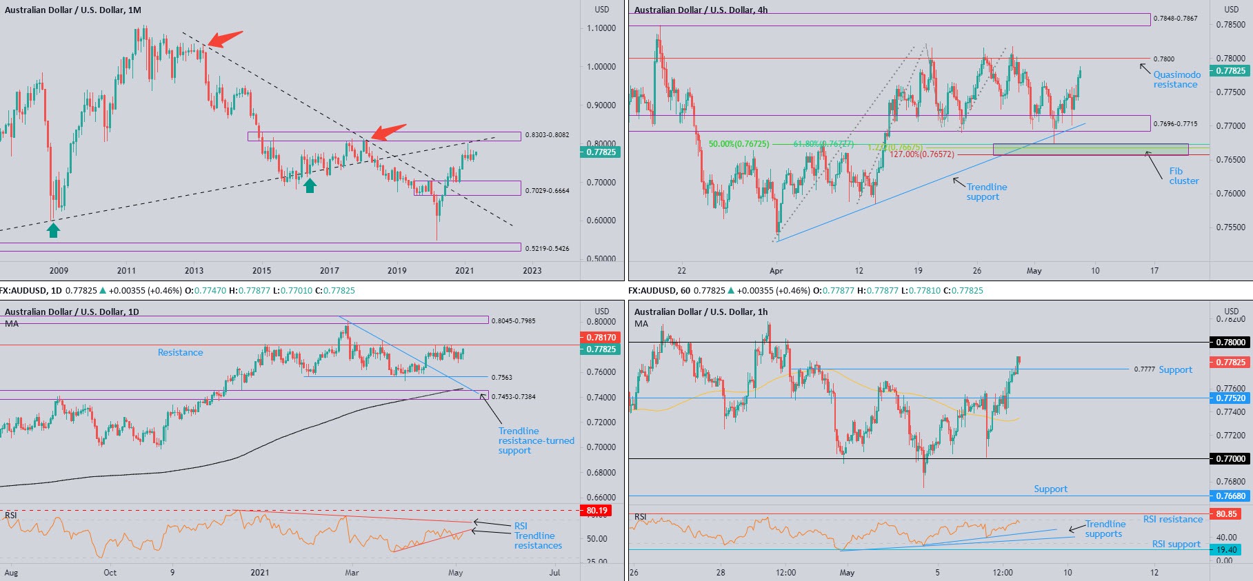 Thursday’s bullish extension, elevated on the back of a waning greenback and technical buying out of 0.7696-0.7715 demand, positions price action within a stone’s throw from Quasimodo resistance at 0.7800.