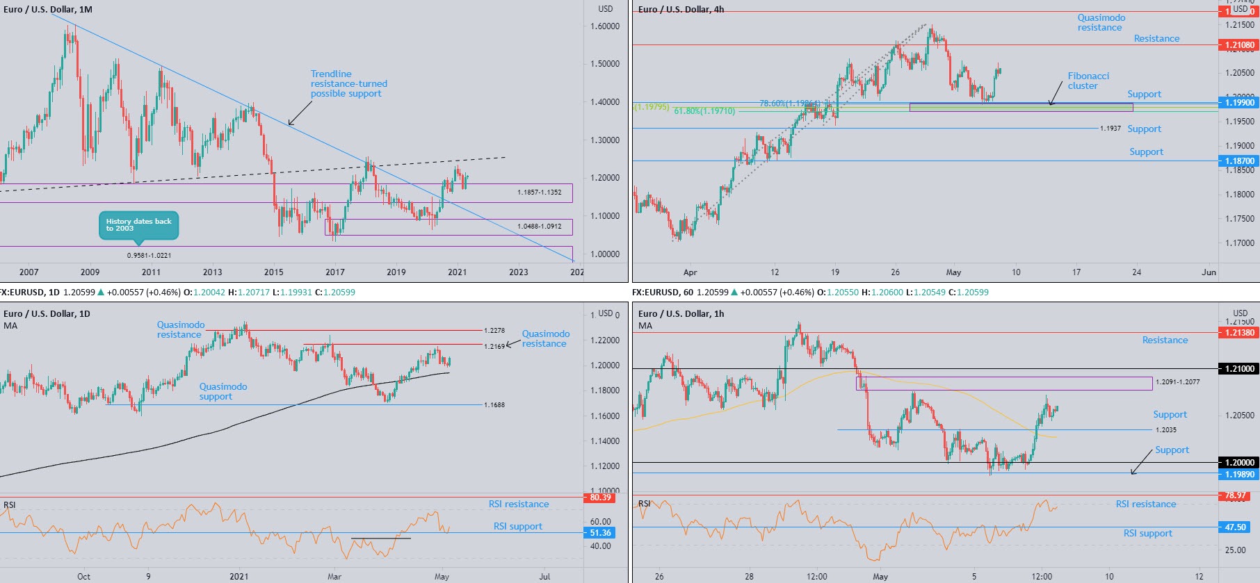 The above analysis, therefore, could reinforce a 1.2035 support retest on the H1 scale, targeting H1 supply at 1.2091-1.2077 and the 1.21 figure (which aligns closely with H4 resistance mentioned above at 1.2108).