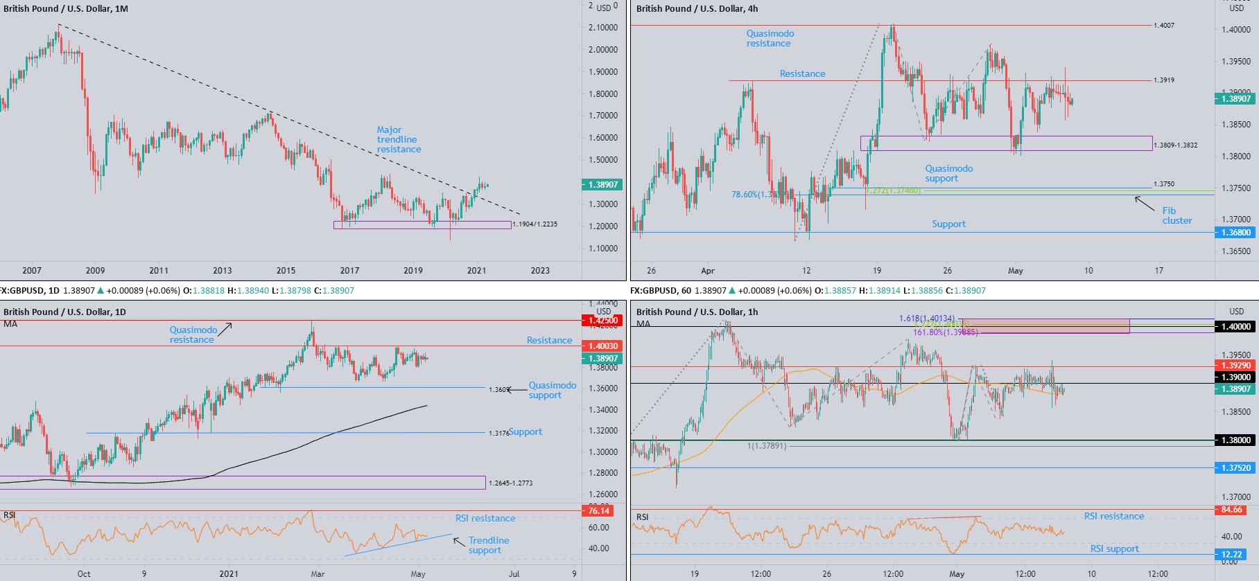 Alternatively, movement above 1.3929 on the H1 paves the way for a short-term bullish scenario to H1 Fibonacci resistance at 1.4013-1.3988 (note this area holds H4 Quasimodo resistance at 1.4007 and daily resistance at 1.4003).