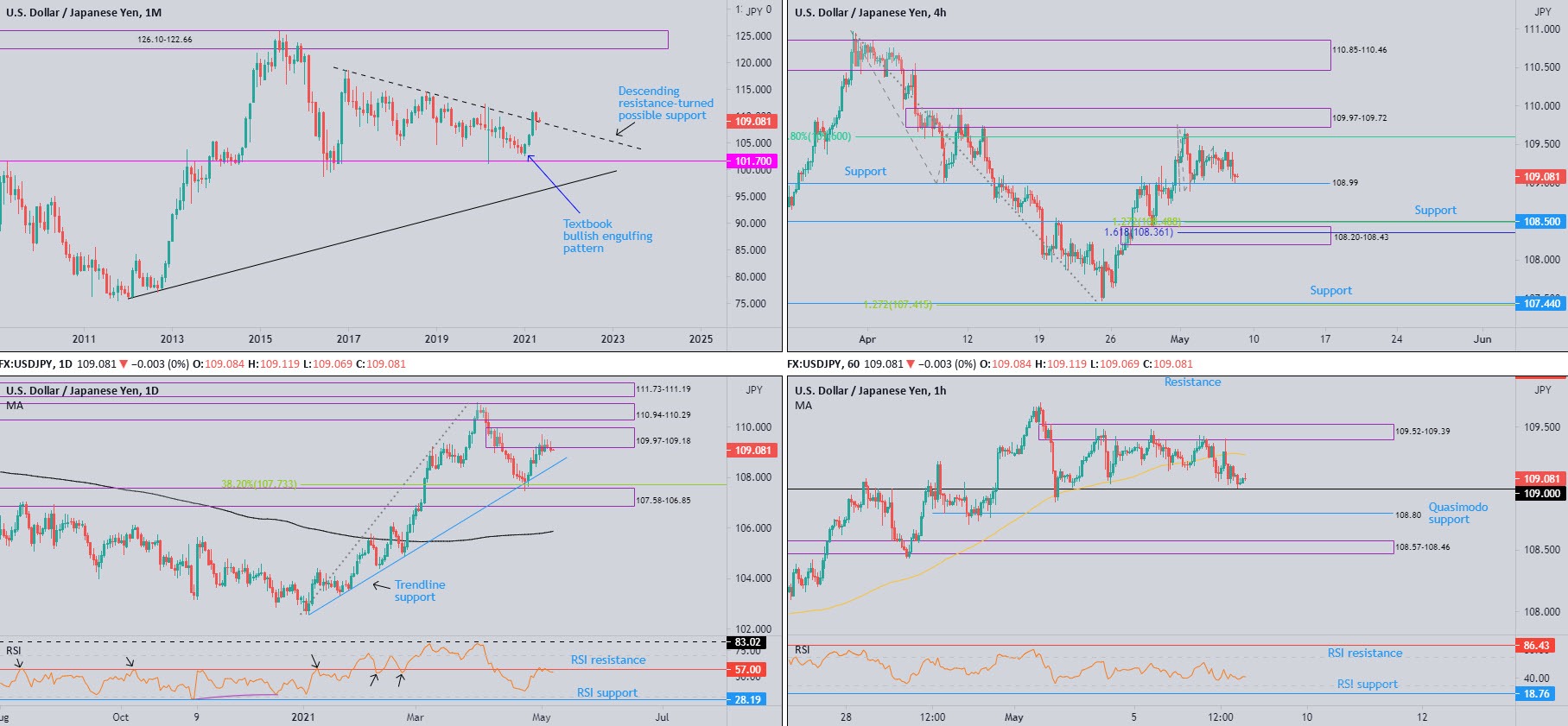 The 109 figure on the H1, aligning with H4 support plotted at 108.99, may entice additional bullish flow today, targeting H1 supply at 109.52-109.39.