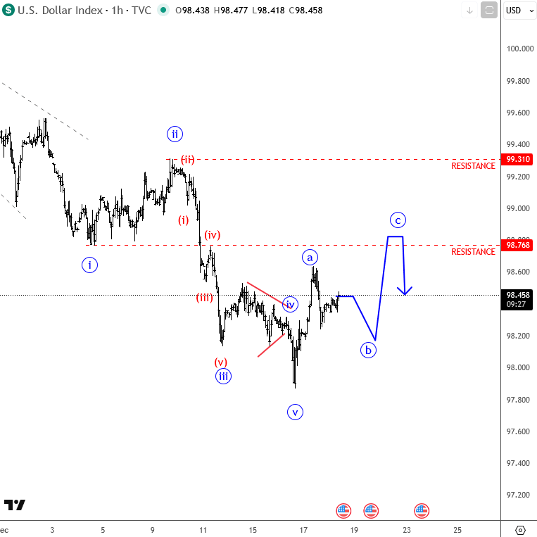 Looking at the Dollar Index, we are already in a recovery phase from yesterday’s lows, which I suspect will unfold in three waves. Ideally this rebound could take us back towards the 98.73 area, which is the first important resistance, and if it extends further then levels around 99 to 99.30 come into focus. The key idea is that this still looks like a temporary corrective bounce within a broader bearish structure, and for now the move higher appears incomplete.
