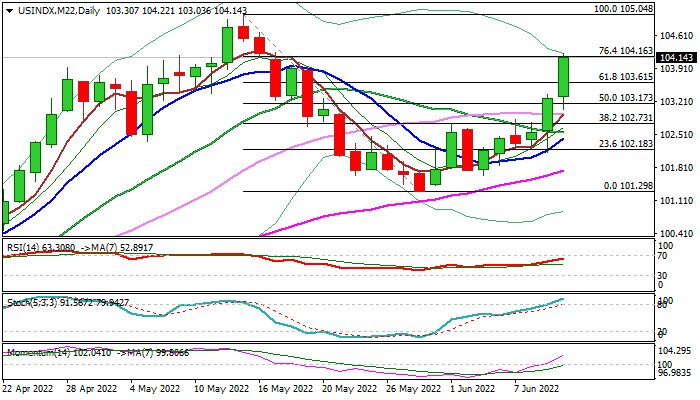 From the technical point of view the picture remains firmly bullish, as today’s rally surged through key Fibo resistance at 103.61 (61.8% of 105.04/101.29 bear-leg) and also cracked the next level at 104.16 (Fibo 76.4%), 14-momentum is in stee=p ascend in the positive territory and rising thick daily cloud continues to underpin the action.