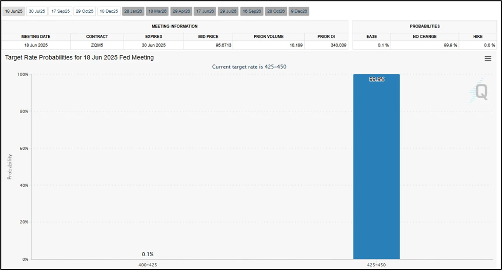 - May CPI’s subdued 2.4 % YoY print keeps real yields capped, reinforcing expectations that the Fed will hold rates again on 18 June.
