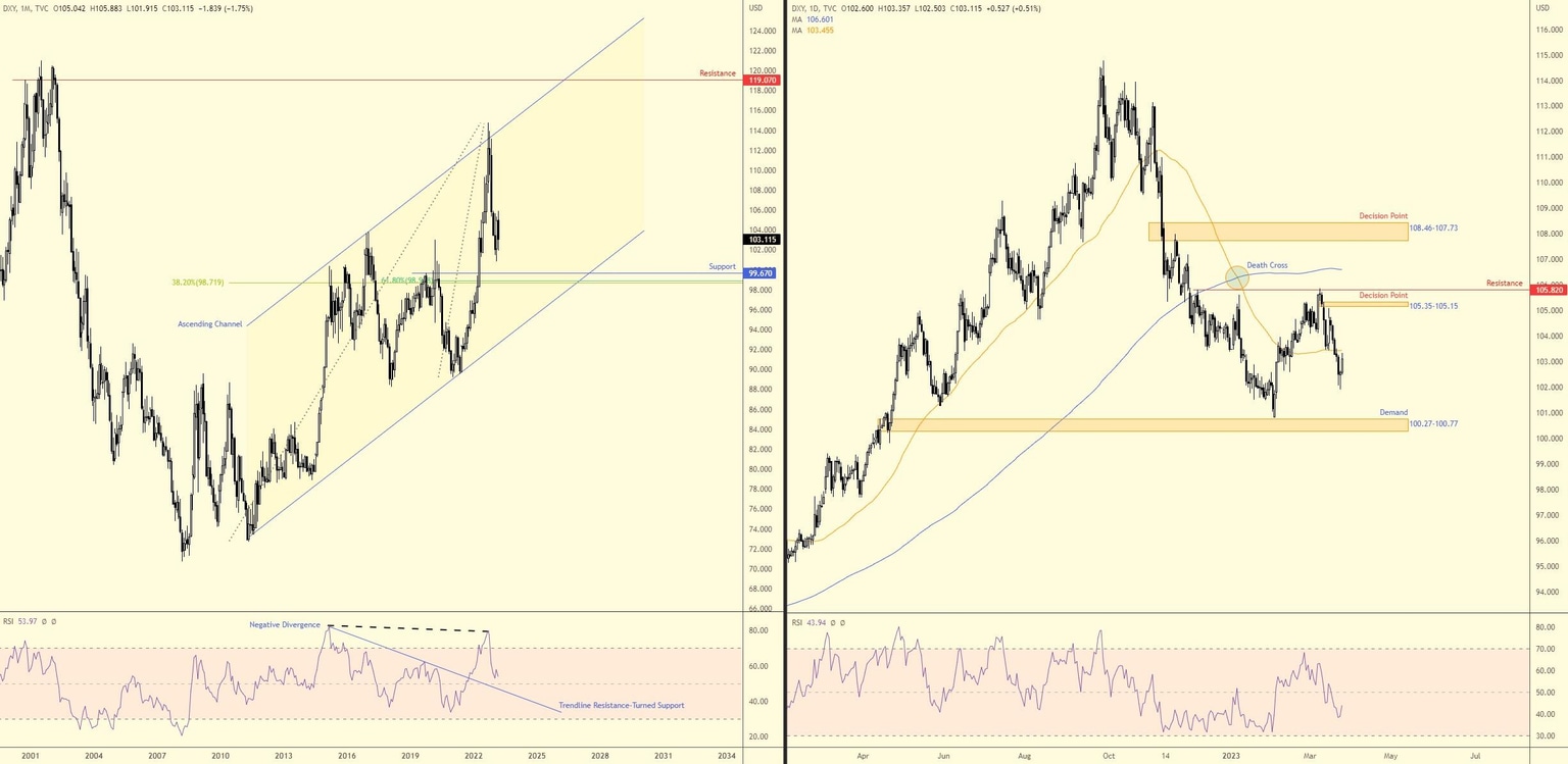 You may recall from the prior week’s Market Insight that I highlighted a bearish scenario could unfold on the US Dollar Index. As you can see on the daily timeframe, the beginning of the week observed a moderate close south of its 50-day simple moving average (103.46), and subsequent bearish flow emerged to touch lows of 101.92 on Thursday. However, the day concluded by way of a hammer candlestick pattern (a Japanese candlestick formation designed to emphasise a bullish signal), which prepared the ground for an advance on Friday. The key observation heading into the final full week of March, therefore (alongside the buck trending south since late 2022), is the underside of the 50-day simple moving average, perhaps establishing dynamic resistance this week, aided by local lows (resistance) of around 103.48. A rejection shifts focus to demand at 100.27-100.77; rupturing the dynamic SMA to the upside, on the other hand, shines the technical spotlight on a thin decision point from 105.35-105.15.