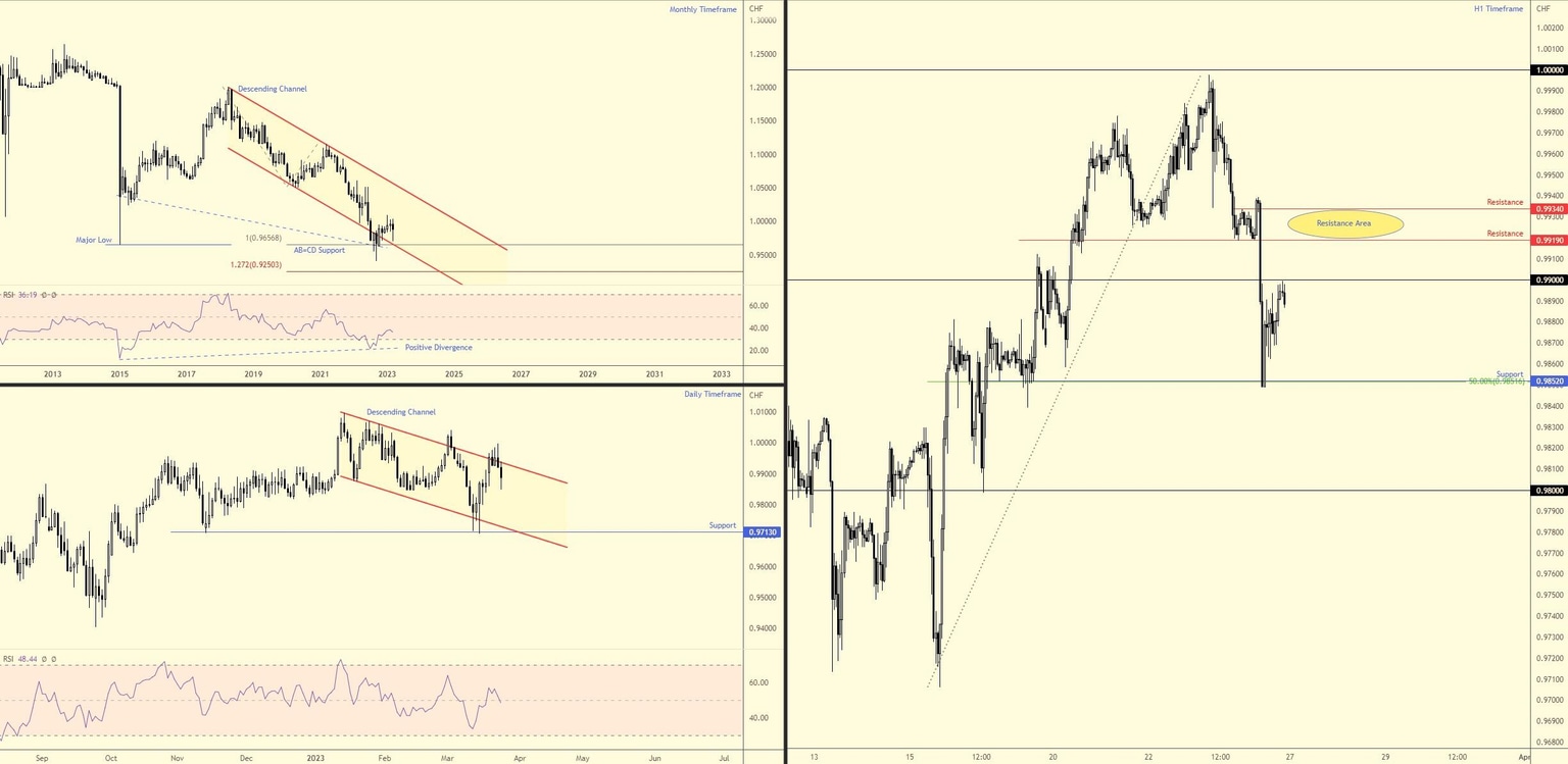 A closer look at price action on the daily timeframe shows the unit testing the limits of a channel resistance etched from the high CHF1.0097. This follows a rebound from support at CHF0.9713 (and channel support from the low CHF0.9875). If we manage to find acceptance north of the aforementioned channel resistance this week, as suggested by the RSI retesting the 50.00 centreline as possible support, limited (obvious) resistance is visible on the daily chart.