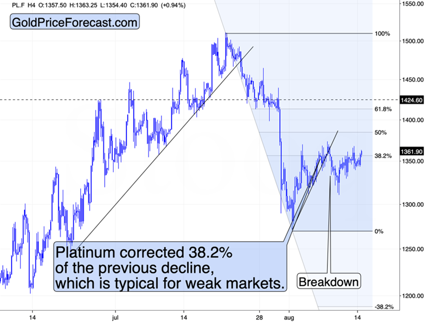 Please note that the second high was higher than the first and third (and also the current fourth) one. This means that it could be the case that platinum is forming a head-and-shoulders top here. Breakdown below $1,310 or so, would likely result in a move to new monthly lows, which – in turn – would likely lead to a move below May lows.