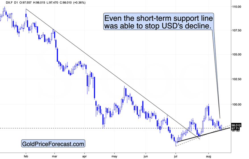 The thick support line is based on the daily closes. The USD Index moved back up after touching it.