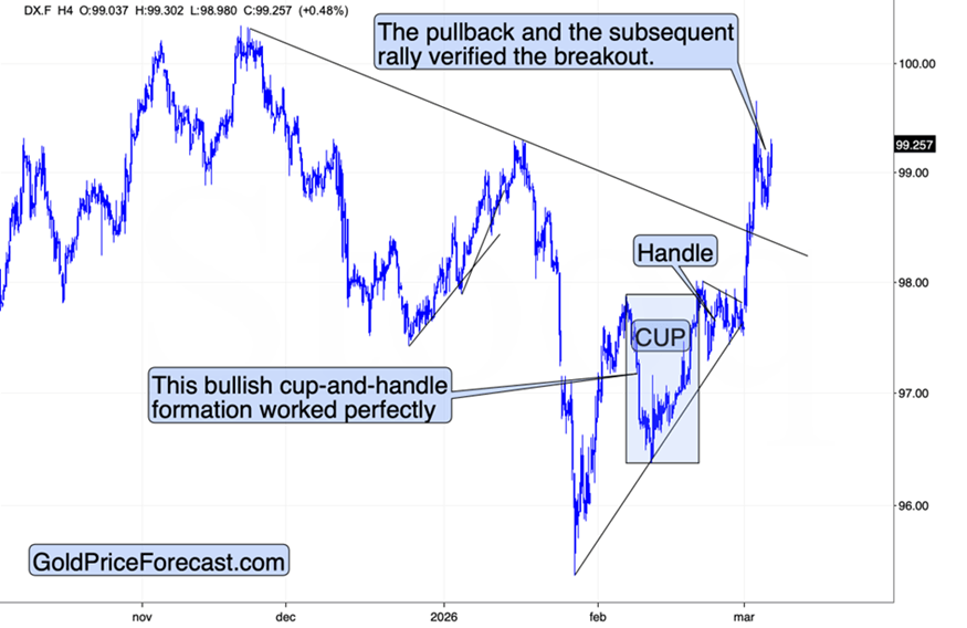 The important detail that we see on the above USD Index chart is the verification of the breakout above the declining resistance line. This is a perfect confirmation of the already-bullish setup based on the short-term cup-and-handle pattern and – of course – based on the long-term and medium-term indications.