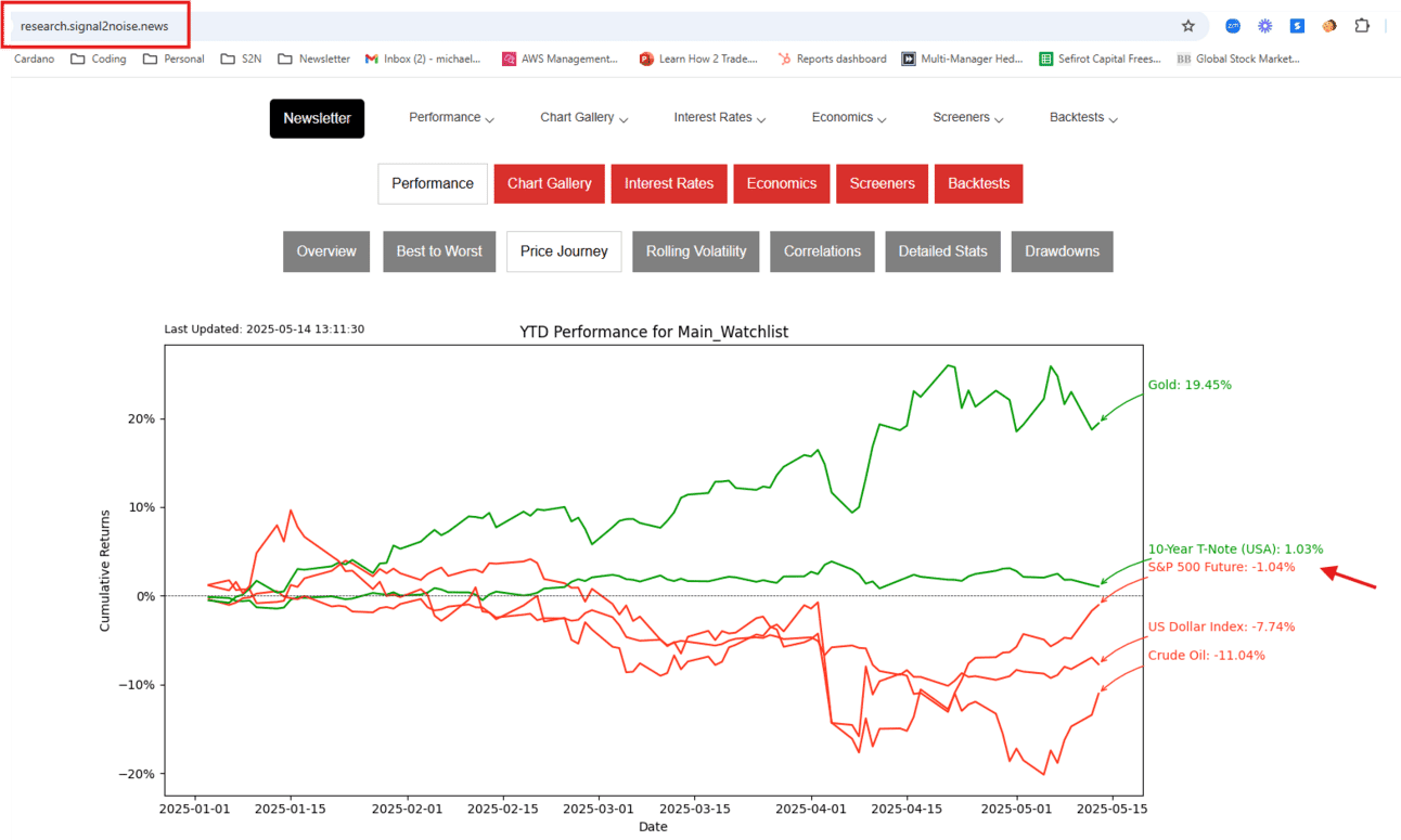 I notice everyone commenting that the S&P 500 is positive for the year. My chart suggests close but not quite. Play around on the site; I am back working on it and updating the different menus.