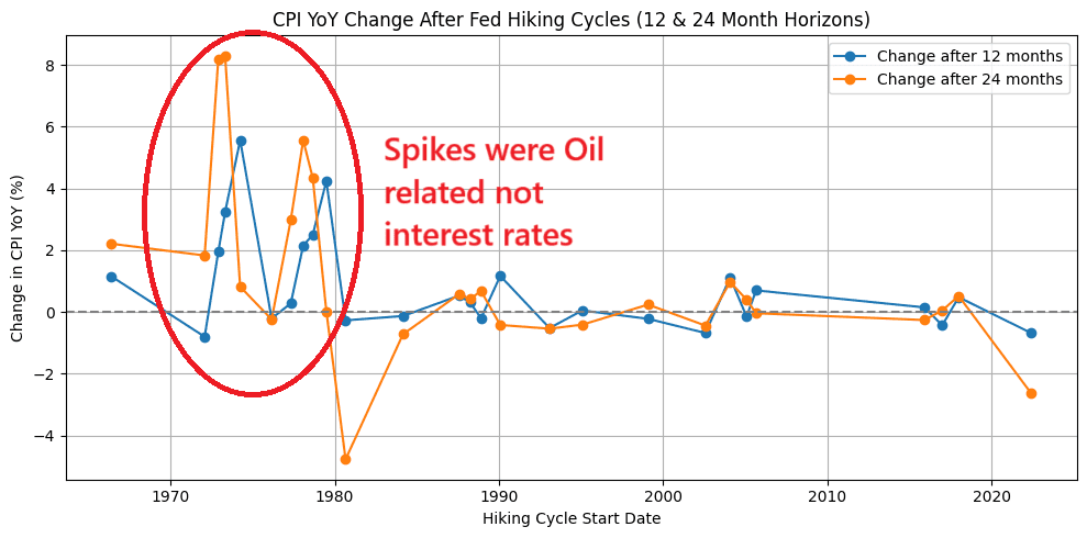 You looked at 26 Fed rate hiking cycles since 1966 and tracked inflation 12 and 24 months later.