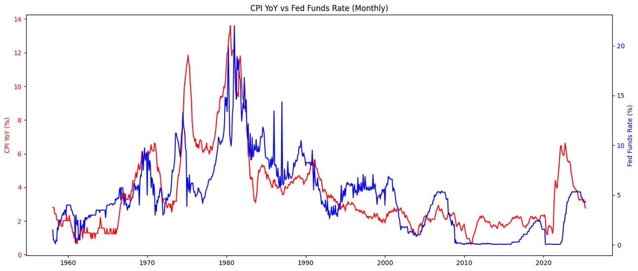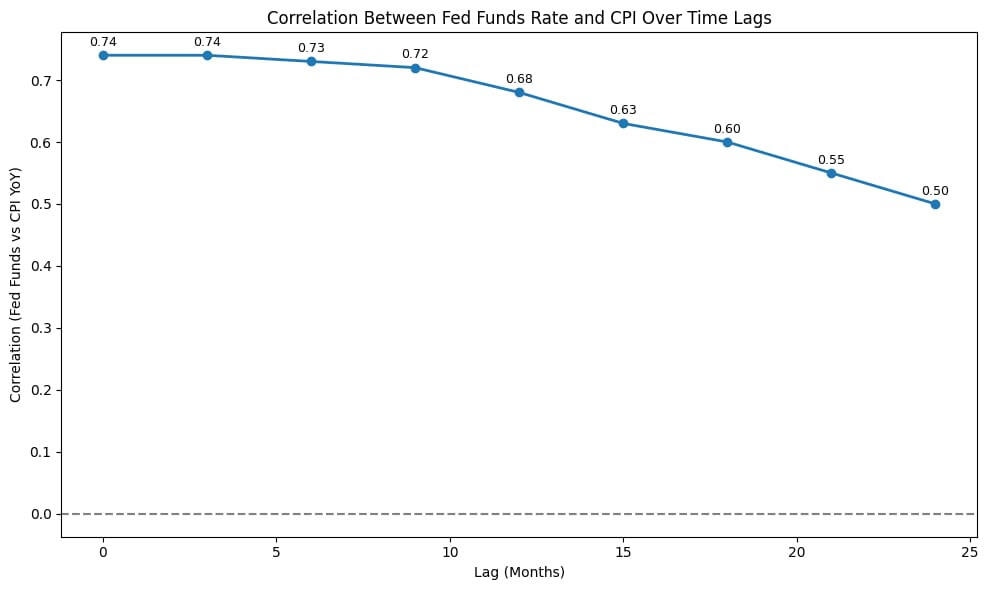 There is a very strong correlation between the Fed Funds Rate and inflation (75%), which decreases as we lag the Fed Funds Rate. Some points need to be clarified. If you are wondering why they are strongly correlated and not inversely correlated, you are thinking the right way. The reason is because the Fed reacts to inflation.