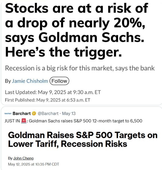 I am not ashamed to change my mind. In fact, being open-minded is important. Goldman Sachs went from calling for a 20% decline to calling for a rise of 12% in 4 days. This is a bit extreme if you ask me. Reminds me of Heads I win, Tails you lose.