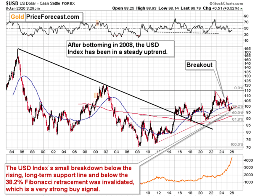 The USD Index has been declining in recent years, but the reality is that it’s after a very long-term breakout that materialized in early 2015 and that was then verified in the following years.