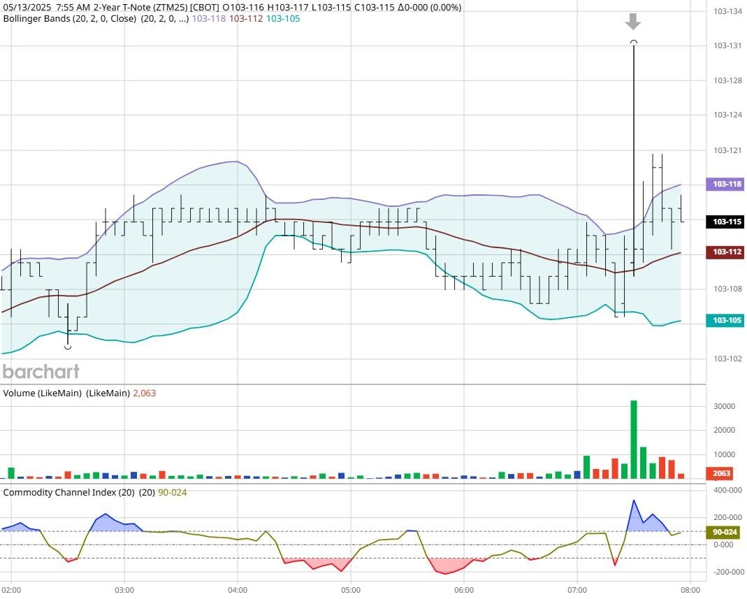 Yesterday the ZT climbed Higher at around 7 AM EST with no economic news pending. The Dow dropped Lower at the same time. Look at the charts below and you'll see a pattern for both assets. The Dow moved Lower at 7 AM EST and the ZT moved Higher at around the same time. These charts represent the newest version of Bar Charts, and I've changed the timeframe to a 15-minute chart to display better. This represented a Long opportunity on the 2-year note, as a trader you could have netted a 20 plus ticks per contract on this trade. Each tick is worth $6.25. Please note: the front month for ZT is now Jun '25 and the Dow is Jun '25 as well. I've changed the format to filled Candlesticks (not hollow) such that it may be more apparent and visible.