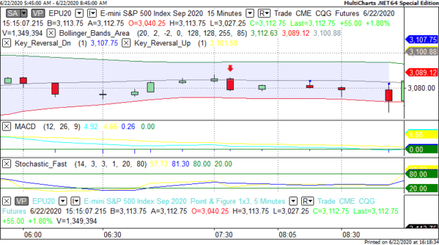 Yesterday the ZB made it's move at around 8 AM EST. The ZB hit a Low at around that time and the S&P moved Lower. If you look at the charts below ZB gave a signal at around 8 AM EST and the S&P moved Lower at around the same time. Look at the charts below and you'll see a pattern for both assets. ZB hit a Low at around 8 AM EST and the S&P was moving Lower shortly thereafter. These charts represent the newest version of MultiCharts and I've changed the timeframe to a 15 minute chart to display better. This represented a Long opportunity on the 30 year bond, as a trader you could have netted about 15 ticks per contract on this trade. Each tick is worth $31.25. Please note: the front month for the ZB is now Sept '20. The S&P contract has been changed to Sept '20. I've changed the format to Renko bars such that it may be more apparent and visible.