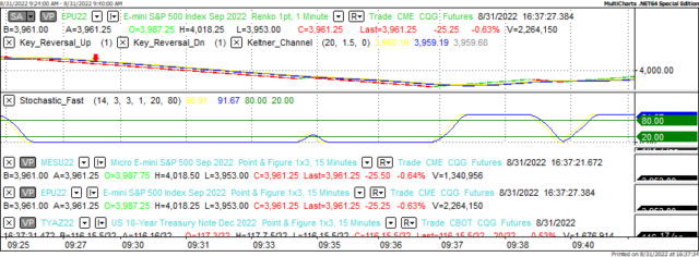 Yesterday the ZN made its move at around 9:30 AM EST. The ZN hit a Low at around that time and the S&P moved Lower shortly thereafter. If you look at the charts below ZN gave a signal at around 9:30 AM EST and the S&P moved Lower at around the same time. Look at the charts below and you'll see a pattern for both assets. ZN hit a Low at around 9:30 AM EST and the S&P was moving Lower shortly thereafter. These charts represent the newest version of MultiCharts and I've changed the timeframe to a 15-minute chart to display better. This represented a Long opportunity on the 10-year note, as a trader you could have netted about a dozen ticks per contract on this trade. Each tick is worth $15.625. Please note: the front month for the ZN is now Dec '22. The S&P contract remains is Sep' 22 for the time being. I've changed the format to Renko Bars such that it may be more apparent and visible.