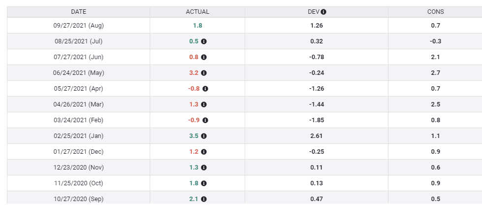 Historically, consumer outlook has been tied to consumption. Analysts expected Retail Sales to follow the sentiment figures lower, with as above, a drop of 0.8% in August.