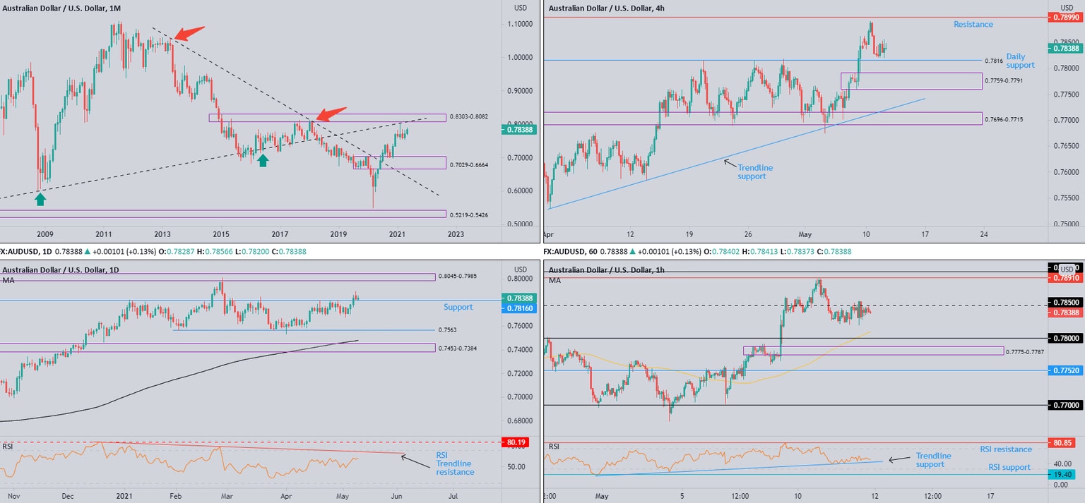 Demand is seen positioned at 0.7759-0.7791 (decision point to break resistance at 0.7816 [now labelled support]); Resistance, on the other hand, is found at 0.7899.