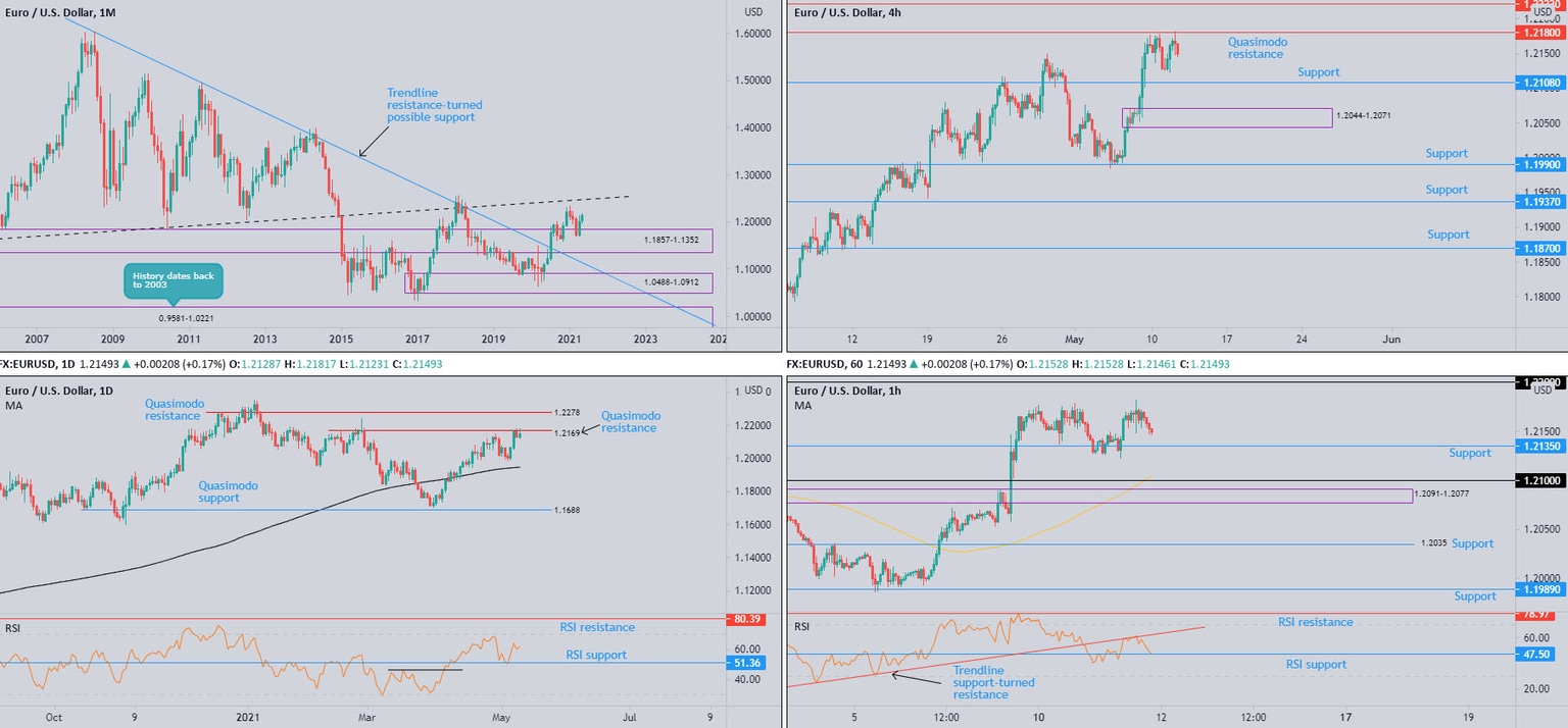 1.2135 support provided a floor for buyers to work with on Tuesday. Although three downside attempts emerged, buyers were victorious (though failed to find acceptance above local tops around 1.2177).