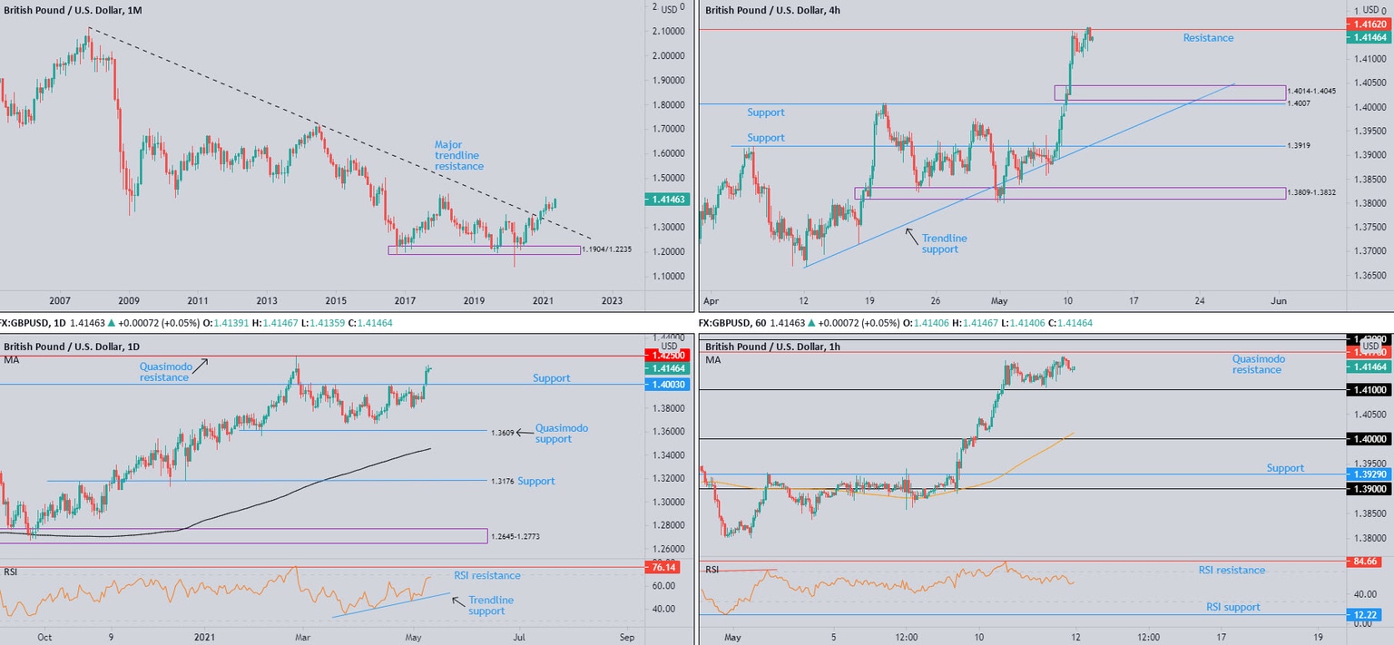 The monthly timeframe shows a trendline resistance breach occurred late 2020. Should the 1.4376 top move aside, longer-term buying may become a key theme in this market. On the daily timeframe, scope to advance is seen until crossing swords with Quasimodo resistance at 1.4250.