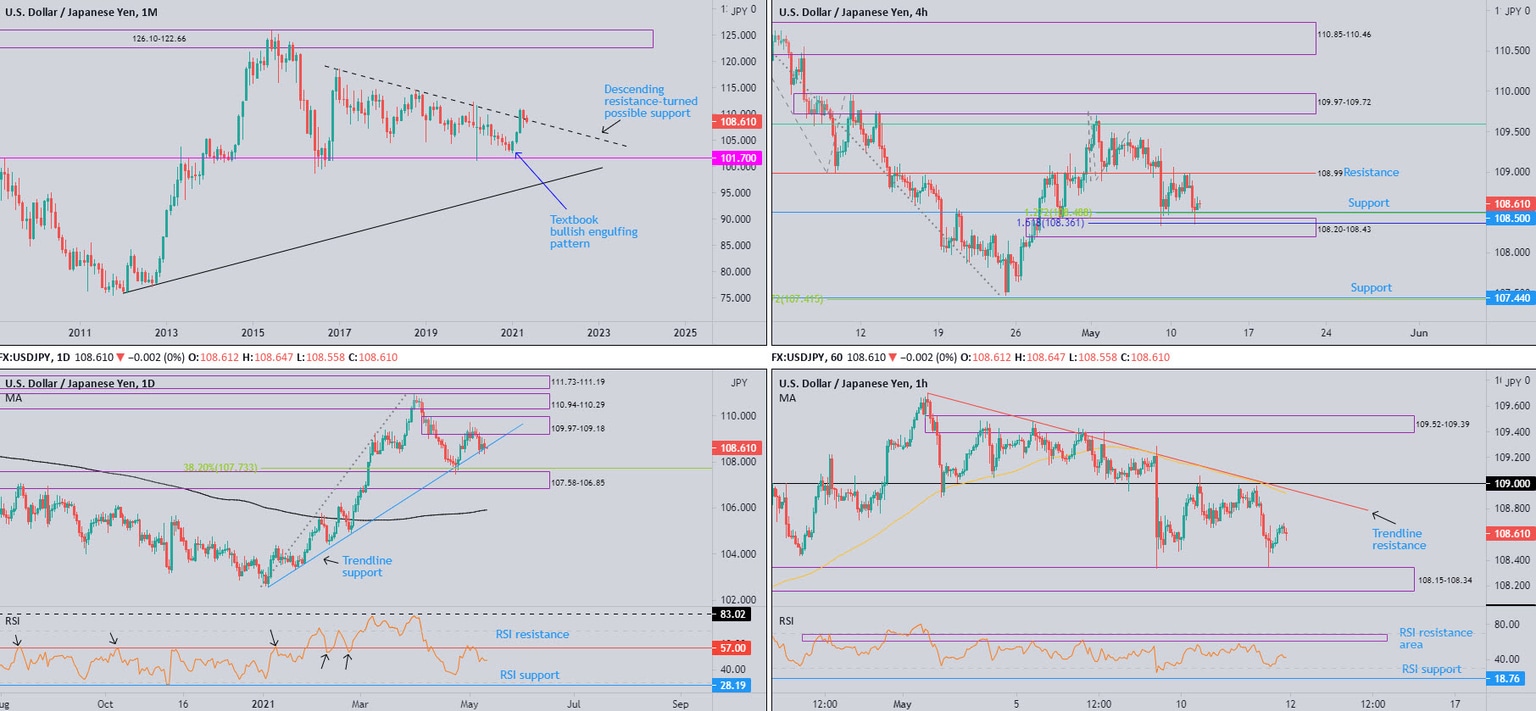 Buyers, as you can see, regained some balance after coming within a stone’s throw of support at 108.15-108.34 (glued to the underside of H4 demand at 108.20-108.43), extended from early March 2020.