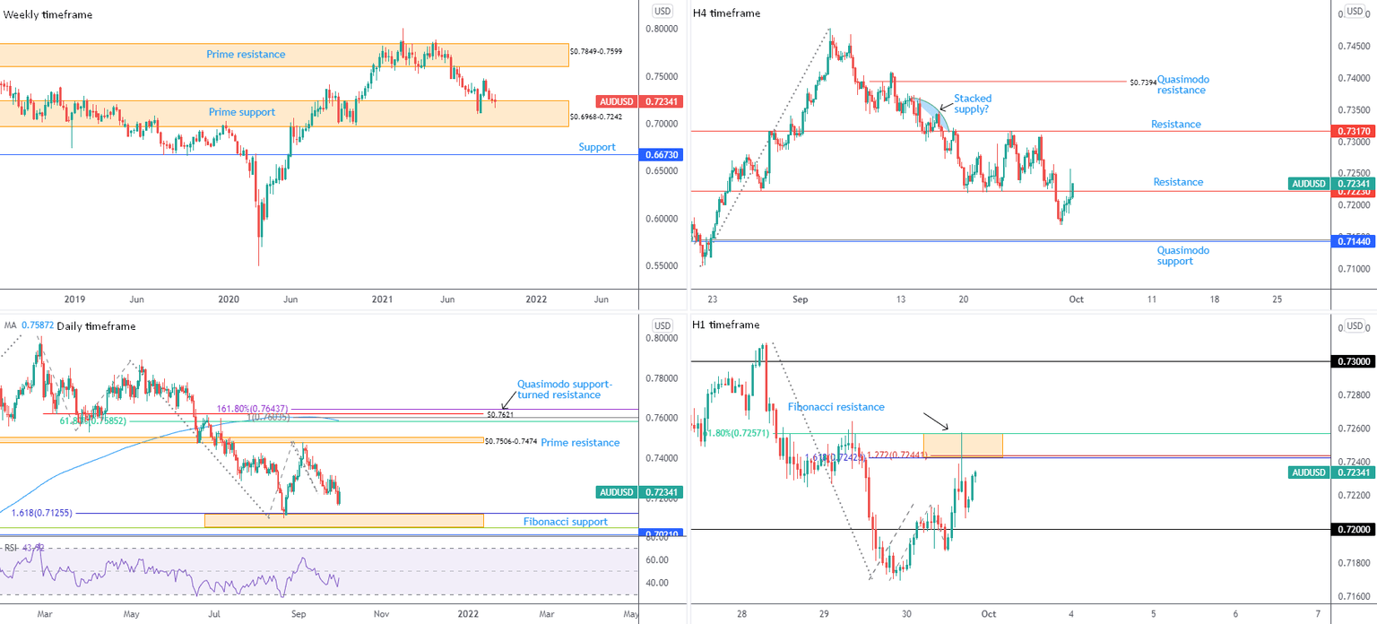 Buyers appear to be gaining strength on the H4 timeframe above resistance at $0.7223, which could lead the unit to H4 resistance at $0.7317 and, by extension, the $0.73 figure on the H1 scale.