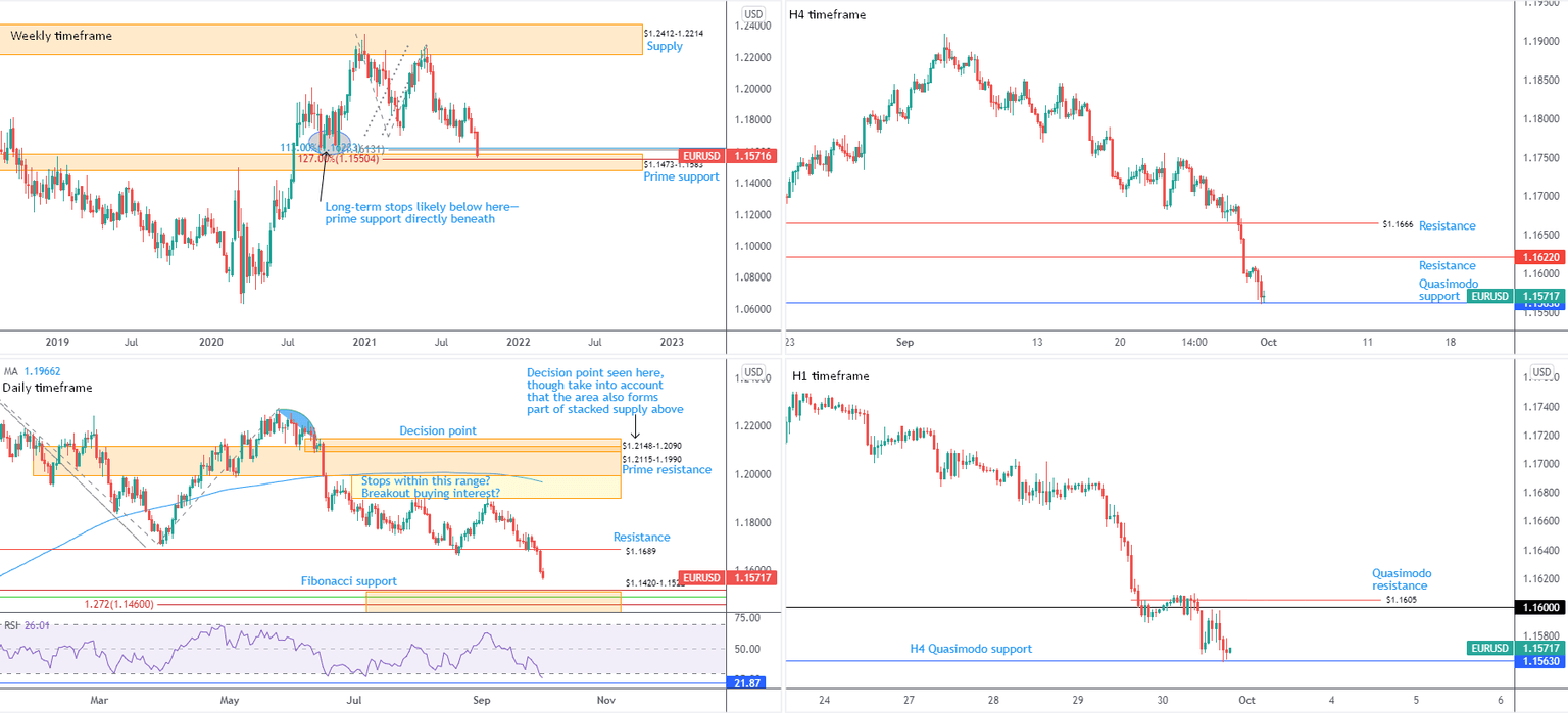 A closer reading of price action on the H1 chart reveals the H4 timeframe’s Quasimodo support at $1.1563 can be drawn on the H1 scale.