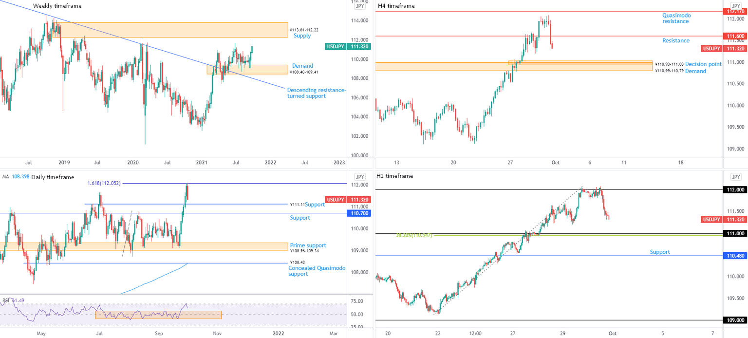Recording 19-month highs at ¥112.08 observed Thursday cross swords with a 1.618% Fibonacci expansion at ¥112.05 and hold. Bearish interest snapped a six-day advance and subsequently seated price ahead of support at ¥111.11, a previous Quasimodo resistance level, and nearby support coming in at ¥110.70.