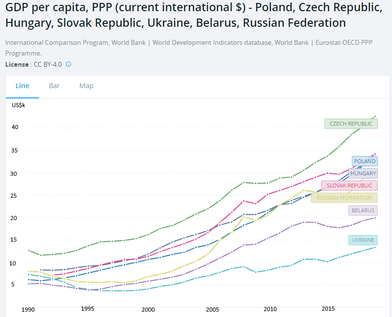 The trio of Russia, Belarus and Ukraine have in common that they are linguistically quite similar and none of the three have joined the European Union. Economically Russia has outperformed the other two due mostly to exports of oil and gas and other commodities.