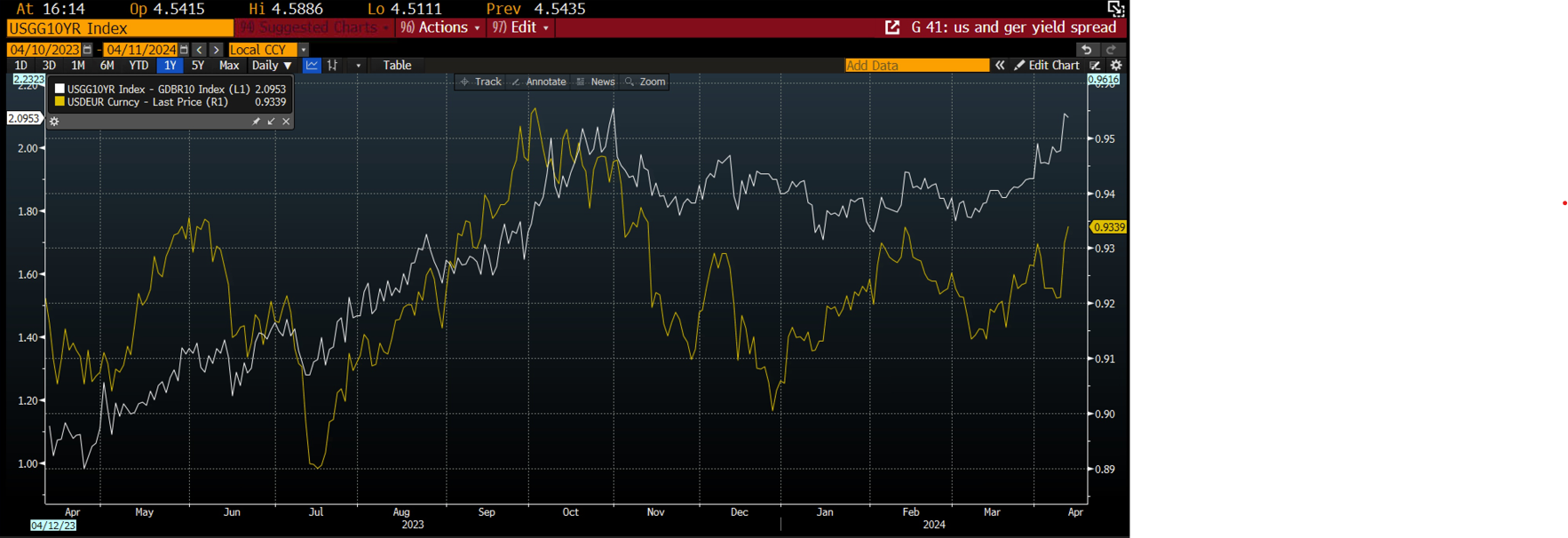 It is this fear that inflation could spread, that is causing German bond yields to move higher by 13 basis points in the last two sessions, even though the ECB was dovish at today’s meeting. Still, the decline in the euro is notable, even with the rise in German bond yields. This is down to interest rate differentials. The ECB is still expected to cut quickly and more frequently than the Fed, which is weighing on the euro and the US 10-year Treasury yield spread with Germany is more than 2%, and is close to its highest level since late October, as you can see in the chart below. The interest rate differential is on the side of the dollar, and EUR/USD continues to decline as we move through Thursday. It is currently testing the $1.07 handle, having dropped nearly 60 pips on the back of the ECB meeting. The next key level below $1.07 is $1.05. If we get to this level, then we could hear talk about parity.