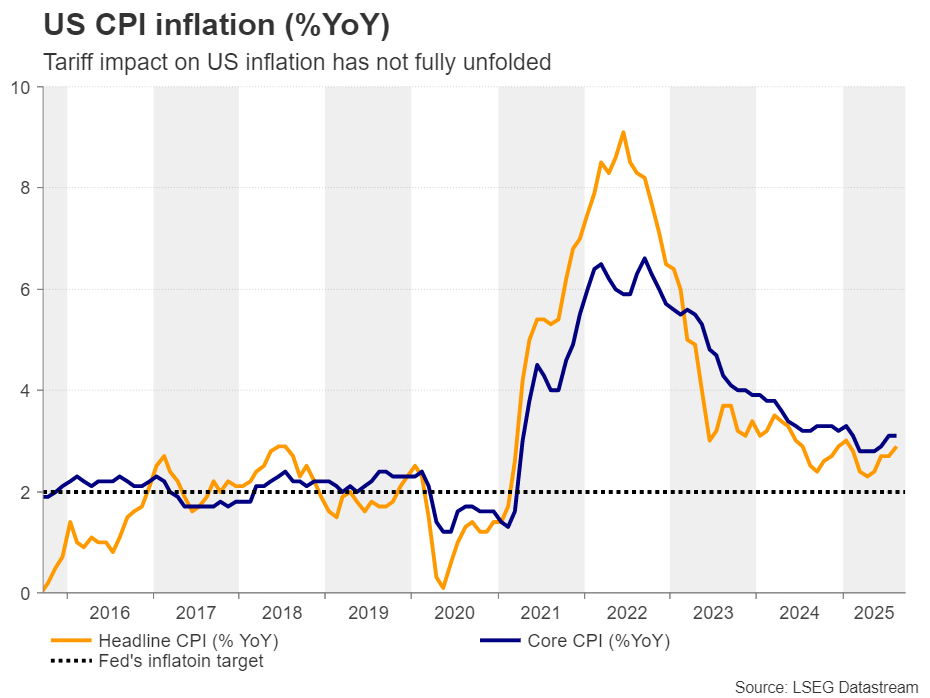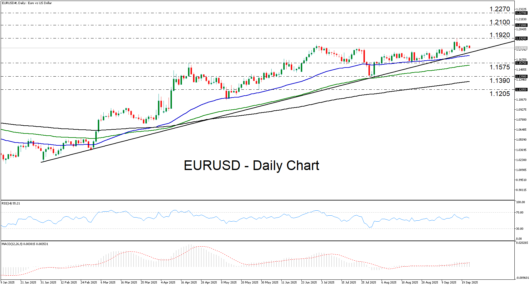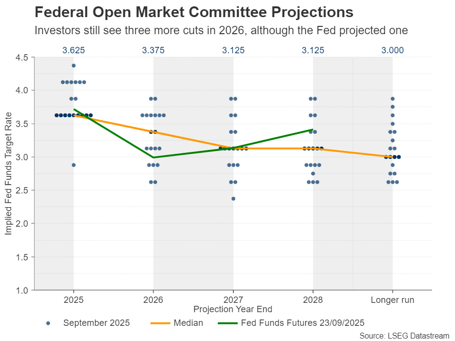 Despite the weakening labor market, the Fed’s own projections showed optimism for the forecast horizon, while economic activity remains solid, with the Atlanta Fed GDPNow model forecasting a 3.3% growth for Q3. Furthermore, although any tariff-induced inflation has not prominently appeared in consumer prices, this may be because companies are absorbing higher import costs to remain competitive.