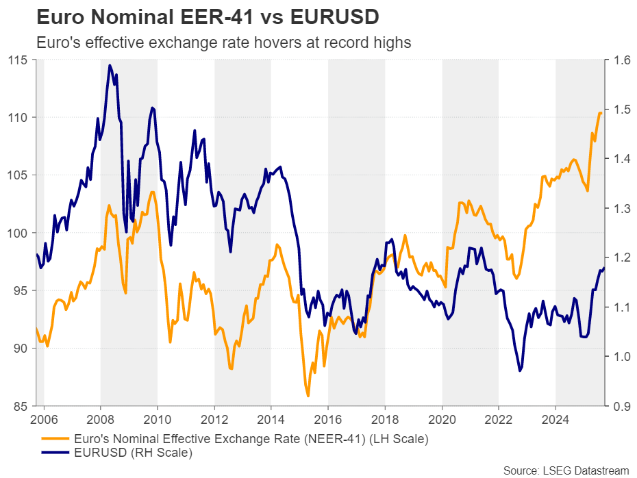 A strong acceleration in the euro could raise disinflationary risks. ECB Vice President de Guindos recently said that they are closely monitoring the euro’s nominal effective exchange rate rather than just its levels against the US dollar. That effective exchange rate, which compares the euro with 41 of Eurozone’s trading partners, is hovering at a record high, up 27% over the past decade. This means that a stronger euro will not only cause inflation to undershoot the ECB’s target but also harm trade and the Euro-area economy.