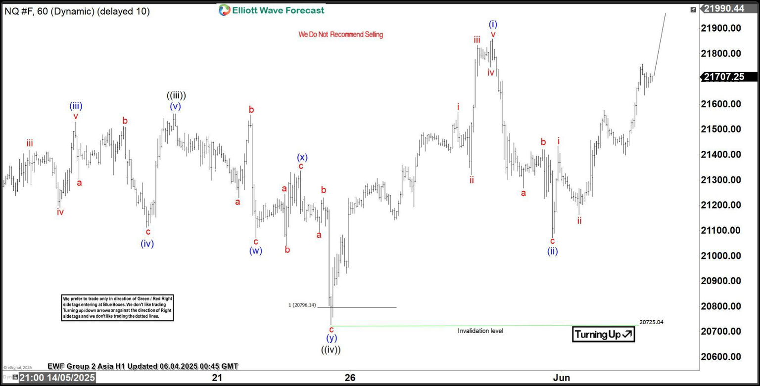 The Nasdaq has since turned higher in wave ((v)). From the wave ((iv)) low, wave (i) advanced to 21,858.75, followed by a pullback in wave (ii) to 21,071.5. The index is now poised to extend higher in wave (iii) of ((v)), continuing the impulsive rally from the April 7 low. In the near term, as long as the pivotal low at 20,725.04 holds, any pullbacks are expected to find support in a 3, 7, or 11-swing pattern, paving the way for further upside. This technical setup suggests the Nasdaq is well-positioned to sustain its bullish momentum in the coming sessions, provided key support levels remain intact.