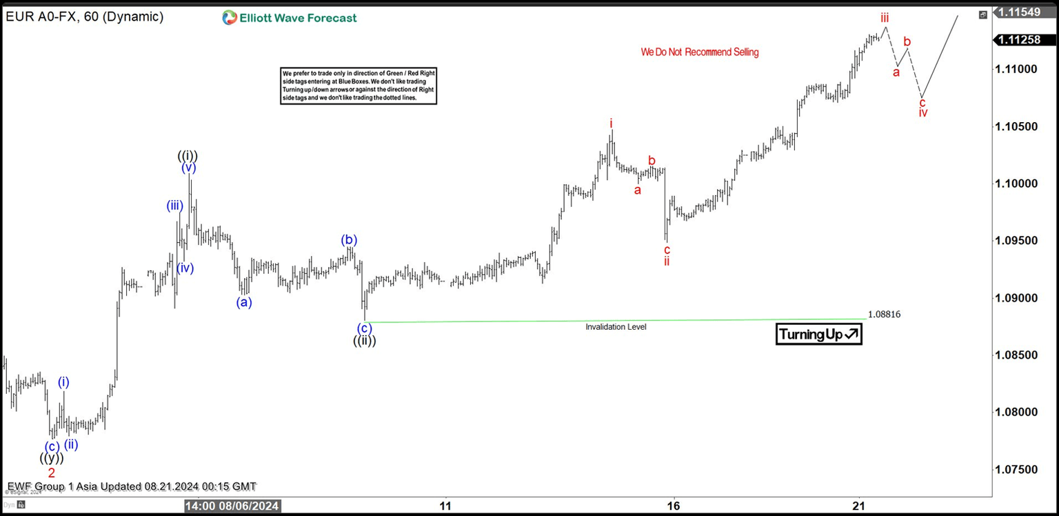 Short term Elliott Wave view in EUR/USD suggests that pair is close to form a bullish sequence. A break above the previous high on 12.28.2023 at 1.1139 suggests the next leg higher has started. Near term, rally from 6.26.2024 low is unfolding as a 5 waves impulsive structure. Up from 6.26.2024 low, wave 1 ended at 1.0948 and pullback in wave 2 ended at 1.0777. Pair has since turned higher in wave 3 which subdivides into another impulsive structure. Up from wave 2, wave ((i)) ended at 1.1 and pullback in wave ((ii)) ended at 1.088.