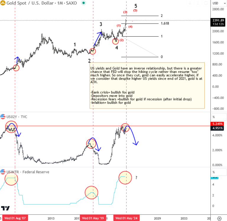 Moreover, gold is rallying amid rising US yields. However, the most intriguing aspect is the potential impact of speculated rate cuts by the Fed later this year. A dovish cycle for interest rates could further propel the current upward trajectory we’re experiencing with gold. Reflecting on historical patterns, gold began its ascent in 2008 as Fed rates decreased, with a similar trend observed from 2019 to 2020 following the Fed’s dovish pivot after hikes between 2016 to 2018.