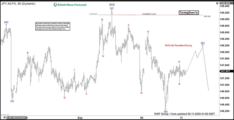 The short-term Elliott Wave analysis for USDJPY indicates that the decline from the August 1, 2025, high is developing as a double three Elliott Wave structure. From that peak, wave ((w)) concluded at 146.2. The subsequent wave ((x)) rally formed another double three pattern at a lesser degree. Starting from wave ((w)), wave (w) reached 148.77, followed by a dip in wave (x) to 146.56. Wave (y) then climbed to 149.1, completing wave ((x)) at a higher degree.
