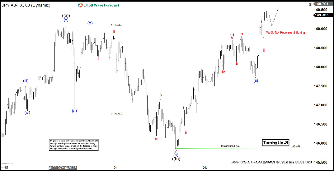 From the May 27 low, wave W concluded at 148.03. A corrective pullback in wave X then followed, which bottomed at 142.67. Currently, wave Y is in progress, with internal subdivision as a zigzag pattern. From the wave X low, wave ((a)) peaked at 149.18, followed by a corrective wave ((b)) that unfolded as a zigzag. Within this structure, wave (a) ended at 147.81 and wave (b) reached 149.08. Wave (c) completed at 145.87, finalizing wave ((b)) in the higher degree. The pair has since resumed its ascent in wave ((c)), developing as a five-wave impulse.