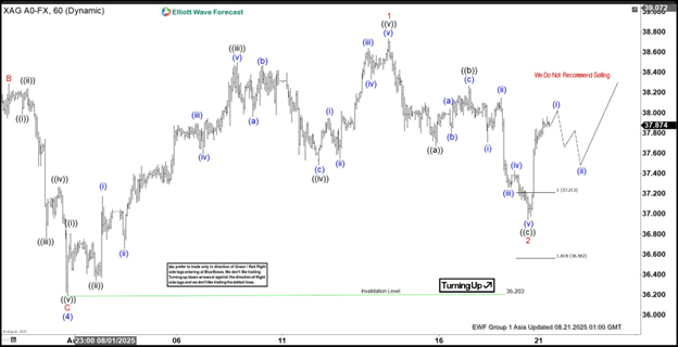 The bullish cycle in Silver (XAGUSD), initiated from the April 2025 low, continues to unfold as an impulse pattern. Starting from that low, wave (1) peaked at 33.68, followed by a corrective dip in wave (2) that concluded at 31.65. Silver then surged in wave (3) to 39.52, with a subsequent pullback in wave (4) finding support at 36.2, as illustrated on the 1-hour chart. Currently, wave (5) is developing as a lower-degree impulse. For the bullish trend to persist without risk of a double correction, Silver must break above 49.52.