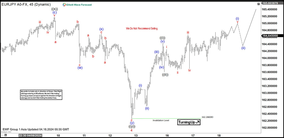Short term Elliott Wave view in EURJPY suggests that rally to 165.35 ended wave 3. Wave 4 pullback unfolded as a double three Elliott Wave structure. Down from wave 3, wave ((w)) ended at 162.59 and wave ((x)) ended at 165.17. Down from there, wave (w) ended at 163.85 and wave (x) ended at 164.69. Wave (y) lower ended at 162.26 which completed wave ((y)) of 4 in higher degree. Pair has turned higher in wave 5.