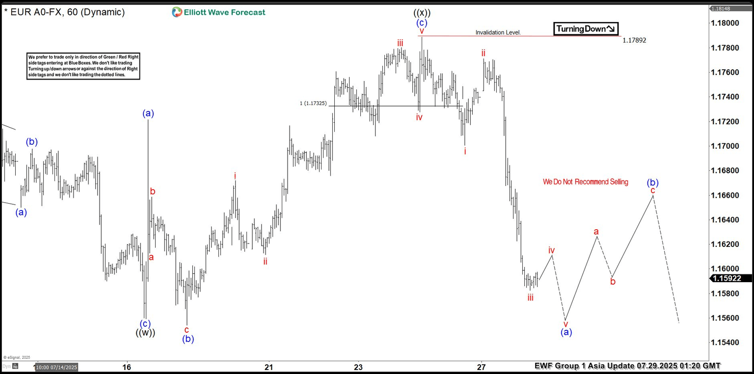 The EURUSD favors upside in 3 swings from September-2022 low & should extend towards 1.1929 or higher against 1.13.2025 low. In 4-hour, it favors double correction lower from 7.01.2025 high to correct 5.12.2025 low. It favors short term pullback in to 1.1512 – 1.1340 area in 7 swing pullbacks before continue rally in cycle from 1.13.2025 low. Above January-2025 low, it ended (1) at 1.0533 high, (2) at 1.0210 low, (3) at 1.1573 high, (4) at 1.1065 low & favors higher in (5). Within 4-hour, it placed 1 at 1.1830 high & correcting in 2 as double three correction before two more highs. It placed ((w)) at 1.1559 low in 3 swings zigzag correction. In ((w)), it ended (a) at 1.1659 low, (b) at 1.1714 high & (c) at 1.1559 low of 7.16.2025. Later, it unfolded expanded flat correction in ((x)) that ended at 1.1788 high of 7.24.2025. Within ((x)), it placed (a) at 1.1721 high, (b) at 1.1554 low & (c) in 5 swings at 1.1788 high.