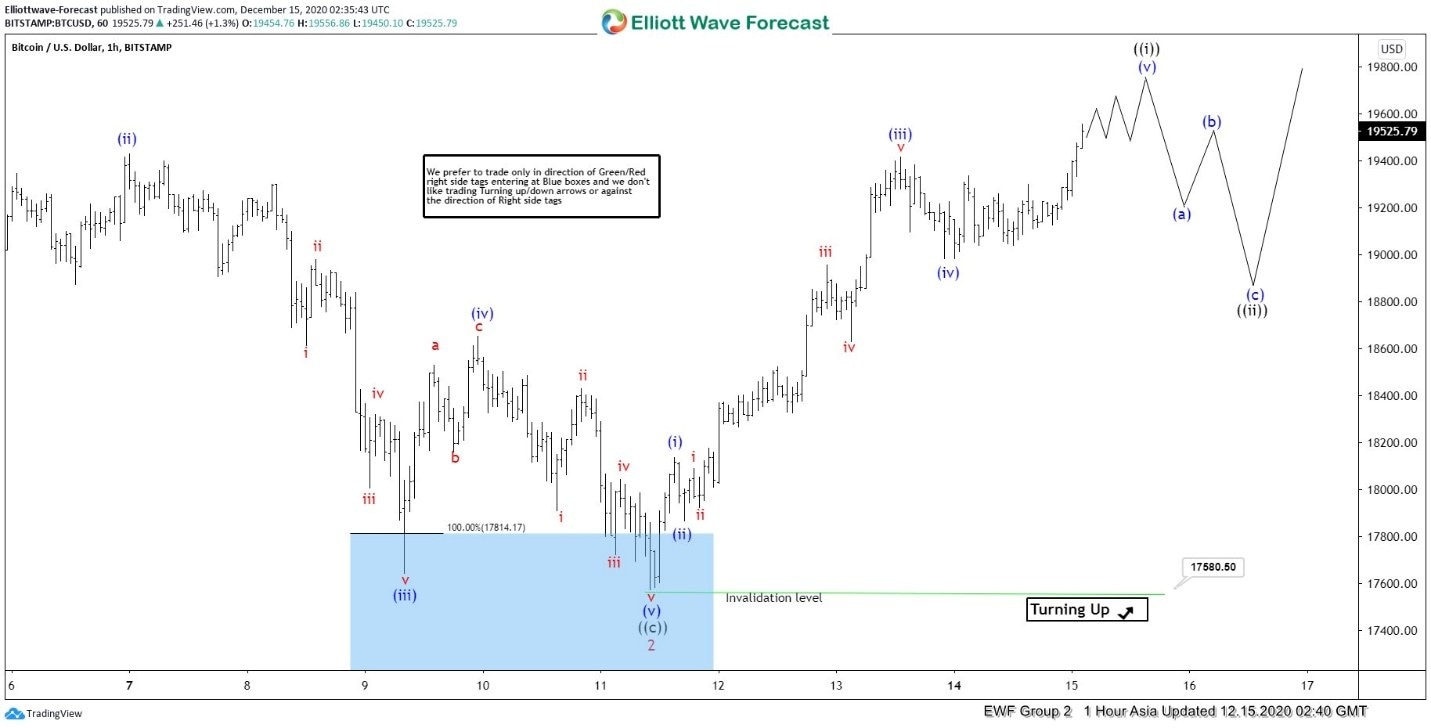 Cycle from November 26, 2020 low in Bitcoin remains in progress as a 5 waves impulsive Elliott Wave structure. Up from November 26 low, wave 1 ended at 19918 and pullback in wave 2 ended at 17580.5. Internal subdivision of wave 2 unfolded as a regular flat. Wave ((a)) ended at 18100, wave ((b)) ended at 19621 and wave ((c)) of 2 ended at 17580.5.