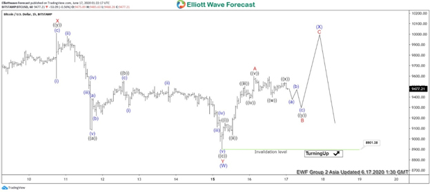 Bitcoin (BTC/USD) is currently correcting the cycle from 3.13.2020 low. The instrument has just ended cycle from 6.1.2020 high (10429) as a double three structure. Down from 6.1.2020 high, wave W ended at 9135 low. The bounce in wave X ended at 10011 high. From there, the instrument extended lower and ended wave Y at 8901.38 low. Bitcoin is now bouncing higher in wave (X) as a zig-zag Elliott Wave structure to correct that cycle in 3, 7 or 11 swings. While bounces fail below 10429 high, Bitcoin can still extend lower later to resume correction against the cycle from 3.13.2020 low in 7 or 11 swings.