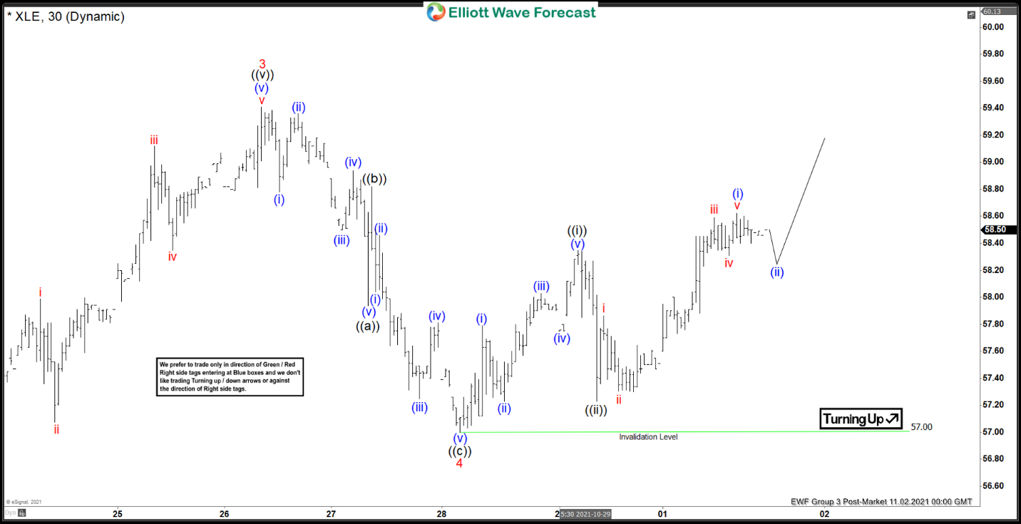 Short-term Elliott wave view in Energy ETF (XLE) shows a 5 waves impulse structure from August 19, 2021 low. Up from there, wave 1 ended at 49.69 and pullback in wave 2 ended at 46.47. The ETF then extended higher in wave 3 towards 59.41 and pullback in wave 4 is also proposed complete at 57. The 1 hour chart below shows the internal subdivision of wave 4 as a zigzag Elliott Wave structure.