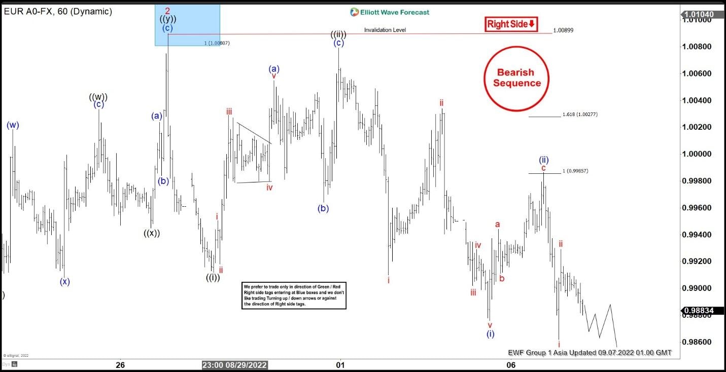 EURUSD shows a bearish sequence from 8.10.2022 high suggesting further downside is likely. The decline from August 10 high is unfolding as an impulse Elliott Wave structure. Down from August 10 high, wave 1 ended at 0.9899 and rally in wave 2 ended at 1.009 as the 1 hour chart below shows. Pair has resumed lower in wave 3 which subdivides into another impulse in lesser degree.