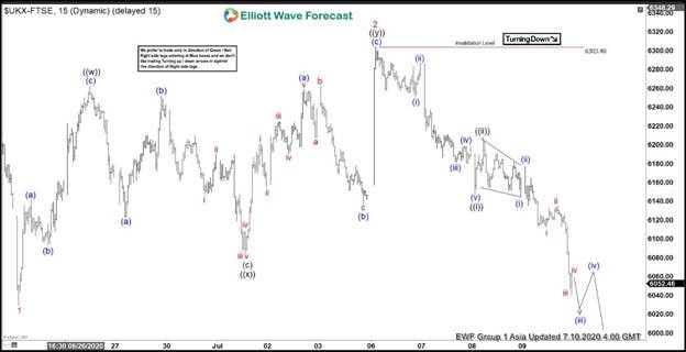 Down from wave 2 high, the index ended wave ((i)) at 6152.88 low. The internal subdivision of wave ((i)) unfolded as 5 waves impulse Elliott Wave Structure. The bounce in wave ((ii)) then ended at 6208.43 high. Wave ((iii)) is currently in progress. Down from wave ((ii)), wave (i) of ((iii)) ended at 6144.52 low and wave (ii) bounce ended at 6134.37 high. Wave (iii) is currently in progress and could see another low before a bounce in wave (iv) can be seen. While below 6303.40 high, expect the bounce in 3,7, or 11 swings to fail for more downside. The downside target for FTSE would be the equal leg area from June 8 high at 5647-5780.